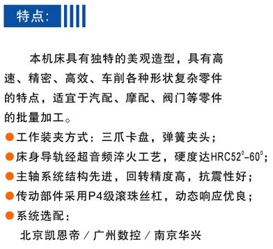 公司生產(chǎn)的CJK系列數(shù)控機床具有精密高、規(guī)格齊、結構合理、通用性強、造型美觀等優(yōu)點。采用高精度軸承,導軌使用超音頻淬火,經(jīng)久耐用。車床采用彈簧快速夾緊,電機直接帶動主軸皮帶輪傳動,并配有縱橫定位裝置控制行程,能完成內外圓車削、端面車削、切斷、割槽等,是儀表儀器、電器、汽車零配件、軸承及小五金行業(yè)零件加工的理想設備。