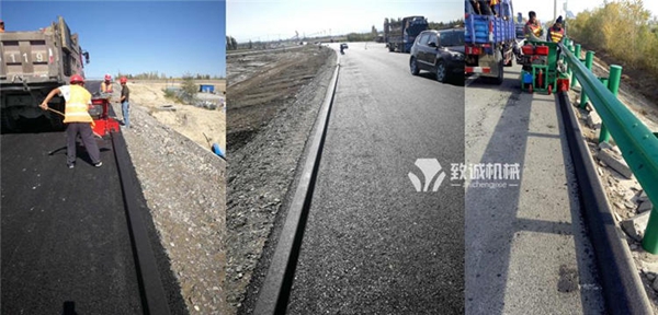 瀝青砂攔水帶成型機(jī)施工方法:施工放樣→安放攔水帶成型機(jī)→瀝青混合料的拌和與運(yùn)輸→上料→牽引→跟機(jī)→清理